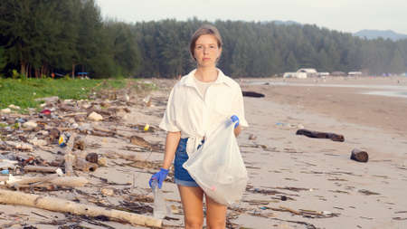 Plastic pollution of the ocean is an environmental problem. Dirty sea beach, garbage on the seashore. A global problem, a threat to ocean wildlife and calling for urgent action to protect the environment
