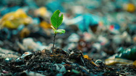 Powerful image depicting a small young tree sprout trying to grow on top of a pile of plastic garbage