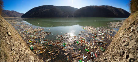 Environmental disaster in Transcarpathia, Ukraine. Residents of mountain villages throw plastic waste directly into the rivers, which bring it to the reservoir and dump it on its banks. Low ecology.