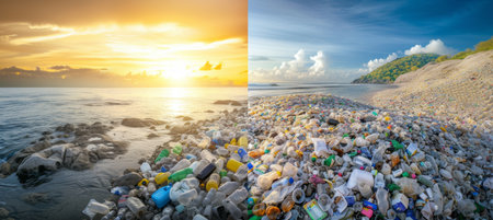 Two contrasting landscapes illustrate the stark reality of waste and the beauty of untouched nature.