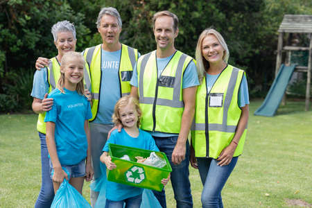 Portrait of caucasian multi generation male and female volunteer group collecting rubbish in field. ecology conservation volunteers cleaning up in the countryside. of