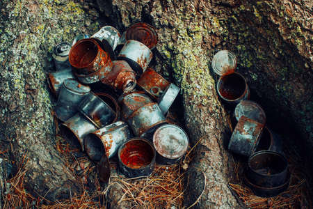 Rusty old metal cans for canned food under tree. Pollution of forest, impact of man on nature.