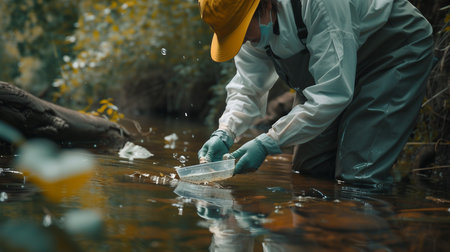 An environmental scientist in protective gear collects a water sample from a riverbank, focusing on assessing pollution levels and ensuring ecosystem health.