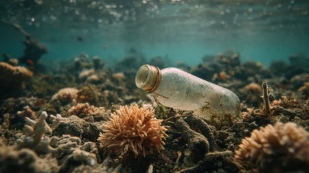 Plastic Pollution Impact: Discarded plastic bottle entangled in bleached coral, symbolic ocean degradation. Somber tone, shallow focus.