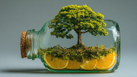 A stunning glass jar showcases a vibrant miniature tree surrounded by citrus fruit slices and lush moss, creating a unique and artistic decoration.