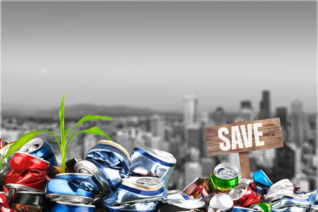 Help earth by recycling. Top view of word SAVE made of trash in composition with different types of garbage as paper, glass, plastics and other on green background. Environmental issues concept