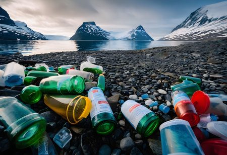 A once-pristine polar fjord now polluted with plastic bottles and packaging materials, highlighting the growing issue of ocean contamination.