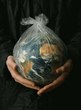 Globe, earth and garbage bag mockup for environment, climate change and pollution concept. Hand