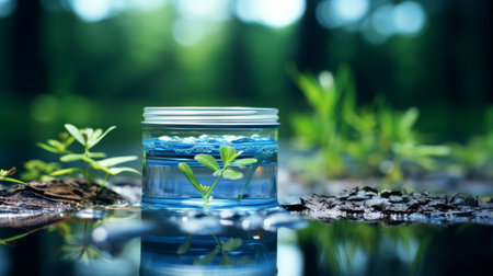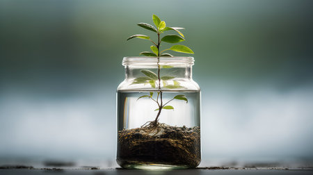 Serene image of a small plant thriving in a glass bottle against a tranquil water backdrop