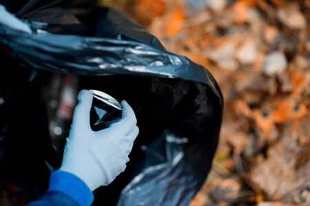 cleanliness before a snowfall. Collection of various garbage in a garbage bag by volunteers, copy space