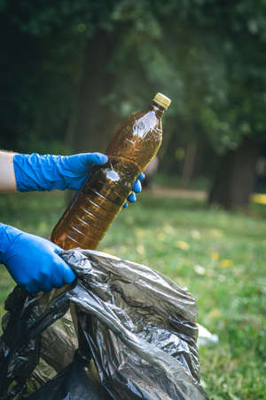 Close-up, a plastic bottle in a male hand, cleaning up nature.