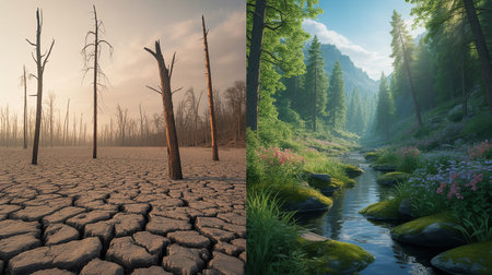 Split image showing cracked dry earth and dead trees next to a vibrant green forest and river.