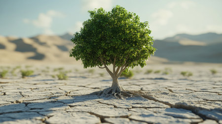 3D illustration of a green tree growing strong in the middle of a dry desert, symbolizing hope and resilience in the fight against desertification for World Environment Day