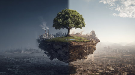 A striking image of two halves of a tree showcasing vibrant green foliage on one side and lifeless brown on the other. This powerful visual metaphor represents the urgent need for environmental awareness and the impact of climate change on ecosystems, set against a parched landscape.