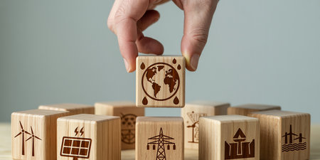 Wind showing hand selecting wooden cube with earth and water drops symbol amidst various energy source blocks keywords: renewable energy,...