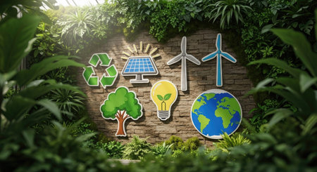 Low-poly Earth surrounded by floating eco-icons in a pastel landscape, background, AI generated
