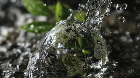Globe submerged in water with splashes, symbolizing environmental conservation and sustainability. globe features green continents and is surrounded by fresh water, representing nature and growth