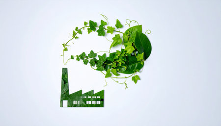 A minimalist composition featuring a green factory icon emitting a plume of vibrant ivy leaves, representing the ideal of a carbon-neutral and eco-friendly industrial revolution.