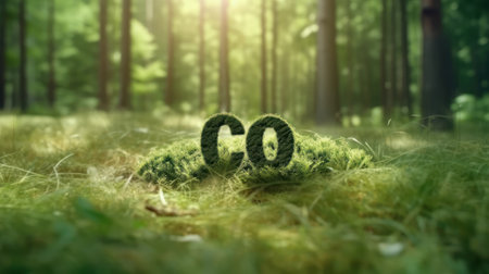 CO2 symbol on green grass in a forest. Lower carbon footprints to limit global warming and climate change. Sustainable development and business based on renewable energy. Reduce CO2 emission concept.