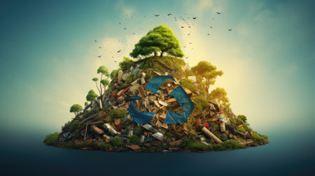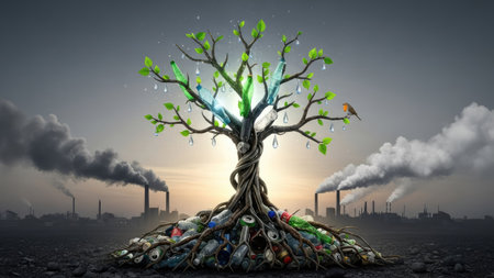 An image presents a tree with green leaves and plastic bottles in its roots, set against a backdrop of industrial pollution. The artwork uses bright colors in contrast with the dark smoke and overcast sky. This composition evokes themes of environmental conservation and the impact of waste, suitable for editorial and commercial use.
