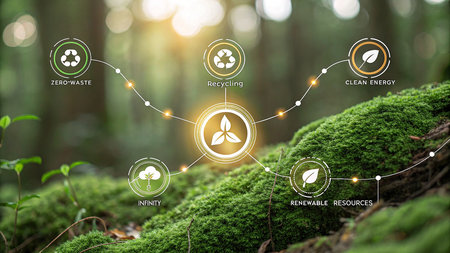 A digital overlay of interconnected icons representing sustainability and technology is superimposed on a lush, moss-covered forest floor, symbolizing the fusion of nature and digital innovation.