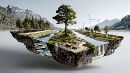 A digital illustration depicts a spherical landmass covered in green foliage and trees, with the word CO2 prominently displayed. The composition features a natural aesthetic with soft lighting and a blurred background, set within a natural environment. Conceptual elements and icons suggest environmental themes, ideal for various commercial uses.