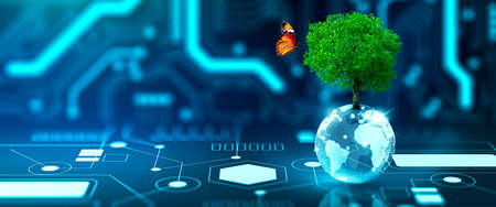 Tree growing on crystal globe. Digital Convergence and and Technology Convergence. Blue light, binary and network background. Green Computing, Green Technology, Green IT, csr, and IT ethics Concept.
