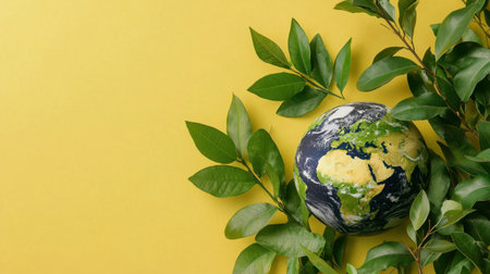 A vibrant depiction of the Earth globe nestled among lush green leaves on a bright yellow background, symbolizing harmony between nature and our planet.