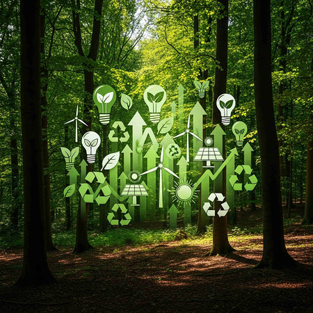 Ecology and environment concept with green energy icons in the forest.
