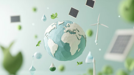 Earth with renewable energy elements such as wind turbines and solar panels, AI generated