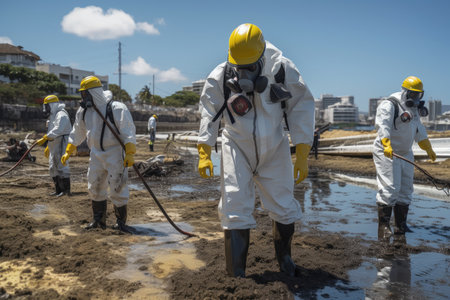 oil spill decontamination team in protective gear, working to prevent further damage and clean up oil, created with generative ai