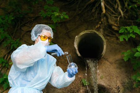 female biochemist or infectious disease specialist using test tubes conducts a chemical test of water against the background of a pipe with leaking water