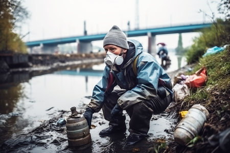 Staff wearing white chemical protective mask and radioactive protective suit check water quality from chemical plants or factory in river, Generative AI