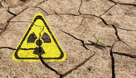 Yellow radioactive sign on cracked dry earth, closeup. Radiological pollution