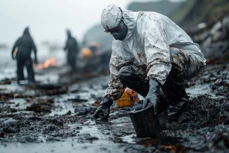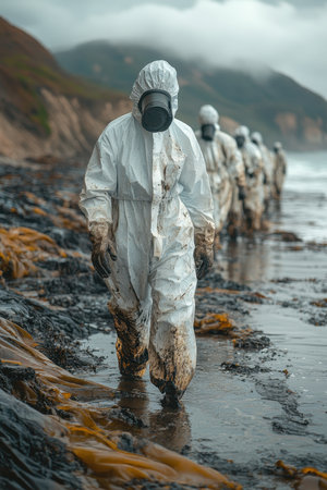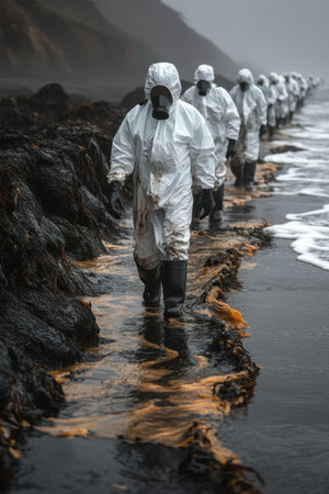 A group of workers in white protective suits walks along the shoreline, cleaning up an oil spill. Waves crash against the rocky beach as they carefully remove contaminated debris in a foggy atmosphere.