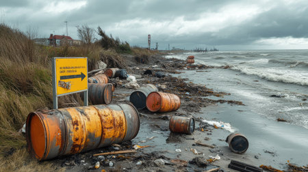 A coastline covered in hazardous waste barrels and industrial debris, with a sign warning of contamination and unsafe conditions for wildlife.