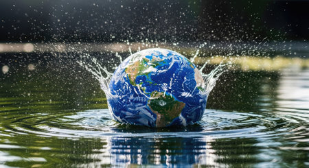 A captivating image of Earth encapsulated within a shimmering water droplet, symbolizing the delicate balance between nature and humanity in a striking dark setting.