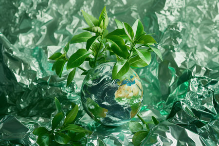 An image presents a globe covered in green vegetation, featuring a prominent CO2 symbol. The composition includes an array of environmental icons surrounding the Earth. The style is digitally rendered, with soft lighting and a focus on natural elements. This scene may be suitable for illustrating environmental concerns or sustainable practices.