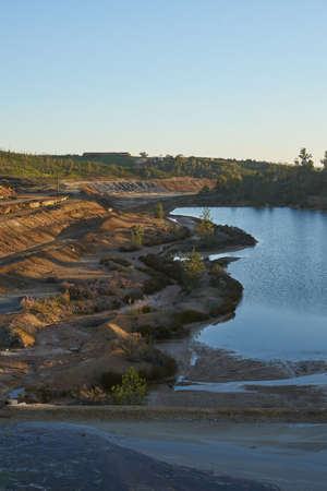 Lake formation in an old abandoned quarry. Quarry lake. Crushed stone dumps in a closed area for stone extraction. Termination of mining operations.