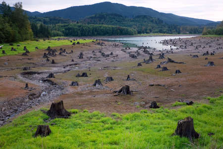 Polluted lake surrounded by dying trees and eroded banks, showing effects of contamination