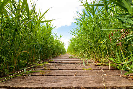 Swamp area covered in swamp grass with wooden path. Blue sky and white cloud - Scenic Park of Przemkow, Poland