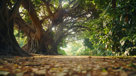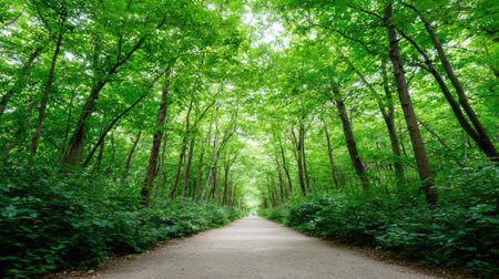A path winds through a verdant forest, surrounded by tall trees and vibrant foliage. Sunlight filters through the canopy, creating a play of light and shadow. The composition focuses on the natural environment, likely suitable for illustrating themes of nature, travel, or environmental conservation, and various commercial purposes.