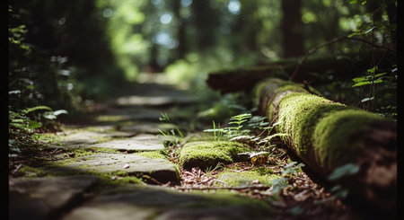 Stone pathway winding into a dense forest, illuminated by golden sun rays filtering through lush green trees. creates a serene and inviting natural scene.