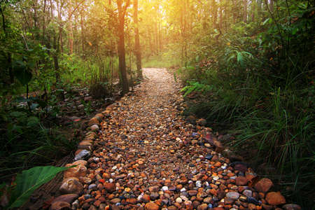 Walking trail filled with gravel amidst the natural beautiful and moisture in the forests.