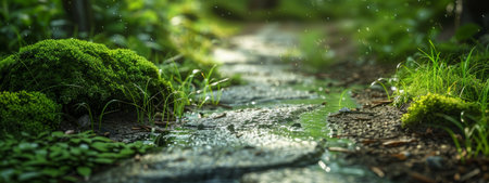 A peaceful nature scene featuring moss-covered stones along a wet path after rainfall. Droplets of water are visible in the soft lighting, highlighting the lush green surroundings.