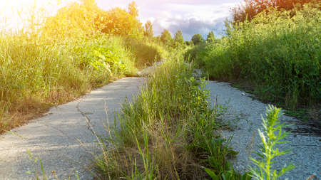 Old rural road of concrete plates with growing grass on spring day. Abandoned way in wild nature. Civilization and environment. picturesque landscape