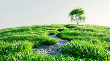 A serene path winds through a grassy field with a majestic tree in the background, blending into the natural landscape under the vast sky