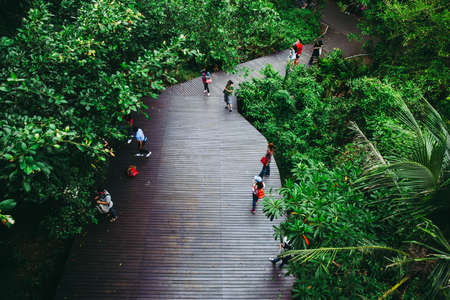 Bang Kra Jao, Samut Prakan, Thailand - October 23, 2019 : Wooden bridge way with people or traveler in Bang Kra Jao, Samut Prakan, Thailand. Asia.