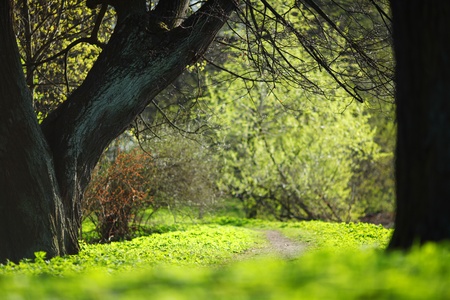 beautiful spring landscape, walking road in a park with trees on a warm spring day