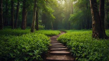 Discover a beautiful wooden pathway meandering through a vibrant green forest, inviting nature enthusiasts to explore the calm and serene wilderness all around.